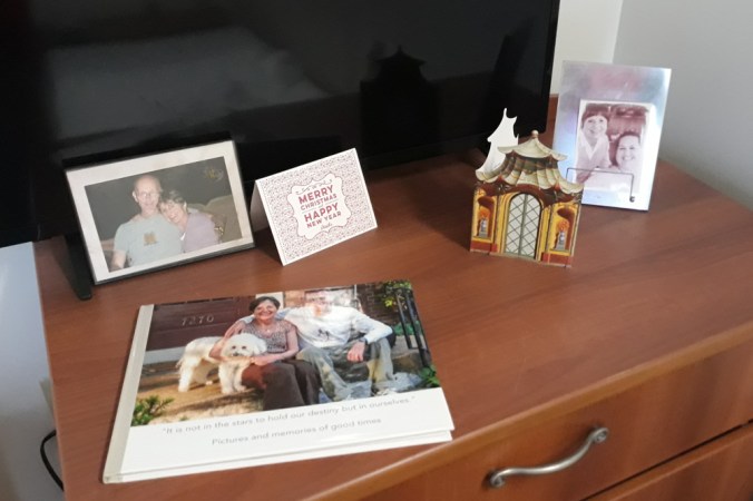 My stepfather has arranged a loving display on the bureau in my mom’s room.