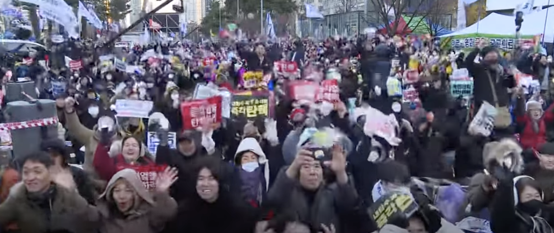 South Koreans cheer the moment an impeachment vote against President Yoon Suk Yeol is announced publicly.